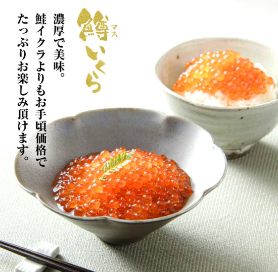 2,980円(内税)ご飯と相性ばっちりのたれで漬け込んだ、鱒いくらまたは紅鮭いくらの醤油漬けです。お得な大容量250g。しらす食堂のお弁当でおなじみ、釜あげいくら丼はいかがでしょう。