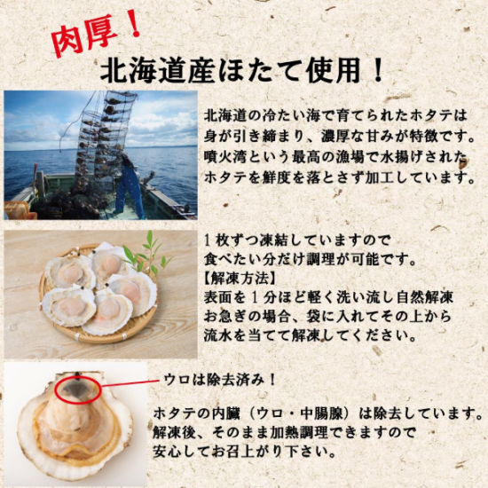 4,980円(内税)ほたて貝をスチームボイルしました。便利なバラ凍結なので、一度のお料理に必要な分だけ取り出して使用できます。天ぷらやバター焼き、鍋、釜飯などのお料理にもご利用ください。
